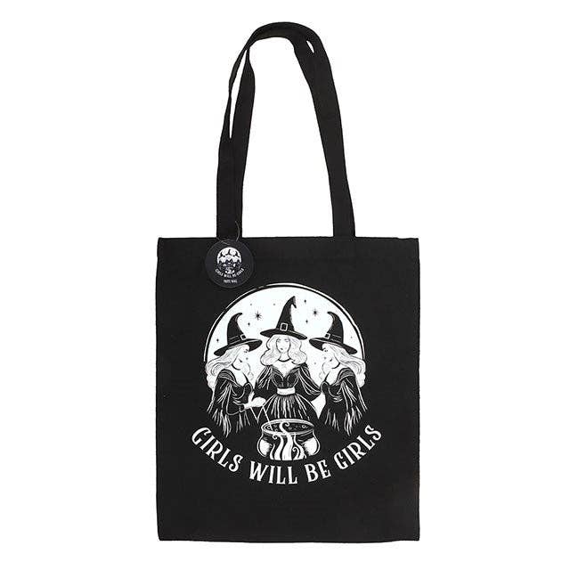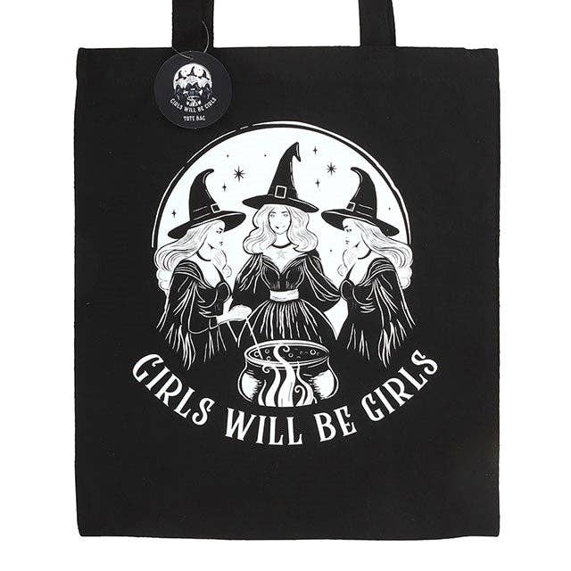 Predveďte svoju čarodejnícku hrdosť na cestách s touto výraznou čiernou nákupnou taškou s trojicou čarodejníc a nápisom „Girls Will Be Girls“. Ideálna na prenášanie kníh, potravín alebo magických pomôcok s nádychom štýlu a osobitého štýlu.